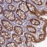 - Immunohistochemical staining of human colon with FAM154B polyclonal antibody (Cat # PAB23666) shows moderate cytoplasmic and nuclear positivity in glandular cells at 1:50-1:200 dilution.