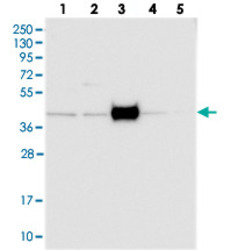 - Western blot analysis of Lane 1: RT-4, Lane 2: U-251 MG, Lane 3: Human Plasma, Lane 4: Liver, Lane 5: Tonsil with FAM154B polyclonal antibody (Cat # PAB23666) at 1:250-1:500 dilution.