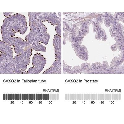 - Immunohistochemistry-Paraffin: FAM154B Antibody [NBP1-90520] - Staining in human fallopian tube and prostate tissues using anti-SAXO2 antibody. Corresponding SAXO2 RNA-seq data are presented for the same tissues.