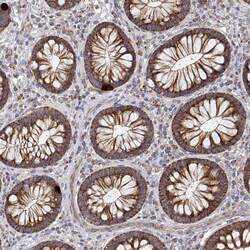 - Immunohistochemical analysis of SPICE1 in human colon using SPICE1 Polyclonal Antibody (Product # PA5-64185) shows strong granular cytoplasmic positivity in glandular cells.