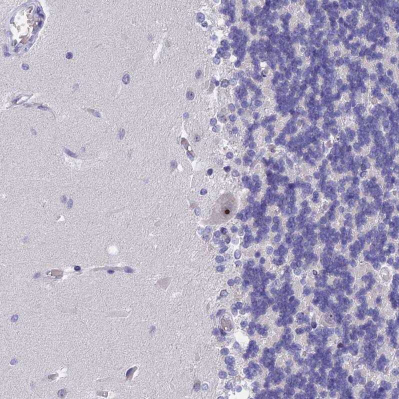 - Immunohistochemical analysis of KNOP1 in human cerebellum using KNOP1 Polyclonal Antibody (Product # PA5-59418) shows strong positivity in nucleoli in Purkinje cells.