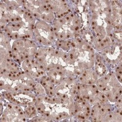 - Immunohistochemical staining of human kidney with CCDC41 polyclonal antibody (Cat # PAB23232) shows strong nuclear positivity in renal tubules at 1:50-1:200 dilution.