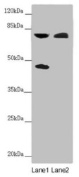 - Western blot All Lanes:CEP83 antibody at 2.27 ug/ml Lane 1: Mouse liver tissue Lane 2: COLO205 whole cell lysate Secondary Goat polyclonal to rabbit IgG at 1/10000 dilution Predicted band size: 83,68 kDa Observed band size: 82,45 kDa
