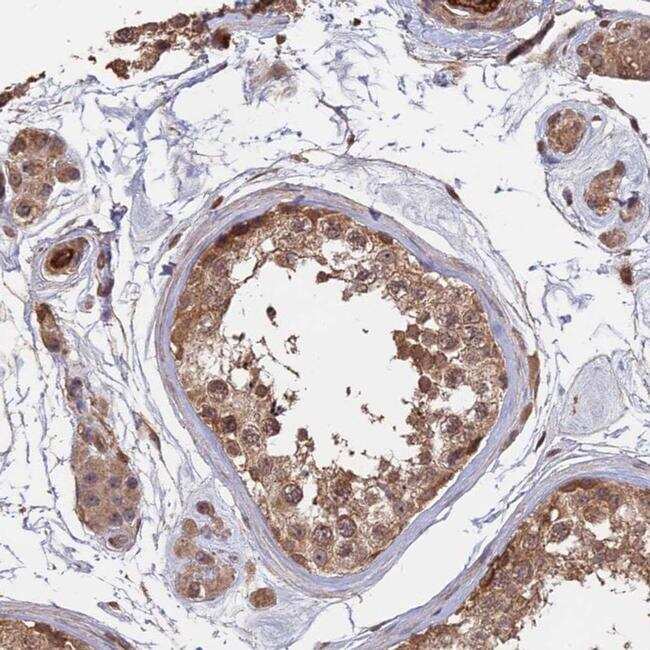- Immunohistochemical analysis of SAC3D1 in human testis using SAC3D1 Polyclonal Antibody (Product # PA5-60076) shows moderate cytoplasmic positivity in cells in seminiferous ducts and Leydig cells.