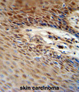 - ZNF324B antibody (C-term) immunohistochemistry analysis in formalin fixed and paraffin embedded human skin carcinoma followed by peroxidase conjugation of the secondary antibody and DAB staining. This data demonstrates the use of the ZNF324B antibody (C-term) for immunohistochemistry. Clinical relevance has not been evaluated.