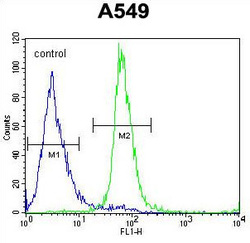 - ZNF324B Antibody (C-term) flow cytometric analysis of A549 cells (right histogram) compared to a negative control cell (left histogram). FITC-conjugated goat-anti-rabbit secondary antibodies were used for the analysis.