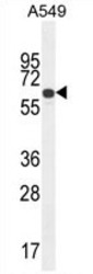 - ZNF324B Antibody (C-term) (AP54691PU-N) western blot analysis in A549 cell line lysates (35 µg/lane). This demonstrates the ZNF324B antibody detected the ZNF324B protein (arrow).