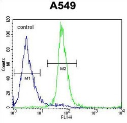 - ZNF324B Antibody (C-term) (AP54691PU-N) flow cytometric analysis of A549 cells (right histogram) compared to a negative control cell (left histogram). FITC-conjugated goat-anti-rabbit secondary antibodies were used for the analysis.