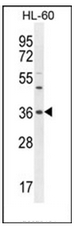 - Western blot analysis of OR1J4 Antibody (C-term) ??in HL-60 cell line lysates (35ug/lane). This demonstrates the OR1J4 antibody detected the OR1J4 protein (arrow).