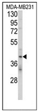 - Western blot analysis of CD158d / KIR2DL4?Antibody (C-term) ?in MDA-MB231 cell line lysates (35ug/lane). KIR2DL4 (arrow) was detected using the purified Pab.