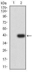 - Western blot analysis using CD158D mAb against HEK293 (1) and CD158D (AA: extra 22-120)-hIgGFc transfected HEK293 (2) cell lysate.