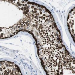 - Immunohistochemical staining of human testis shows strong cytoplasmic and nuclear membrane positivity in cells in seminiferus ducts.