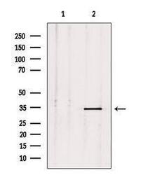 - Western blot analysis of extracts of mouse brain tissue using PLSCR2 antibody. Lane 1 was treated with the blocking peptide.