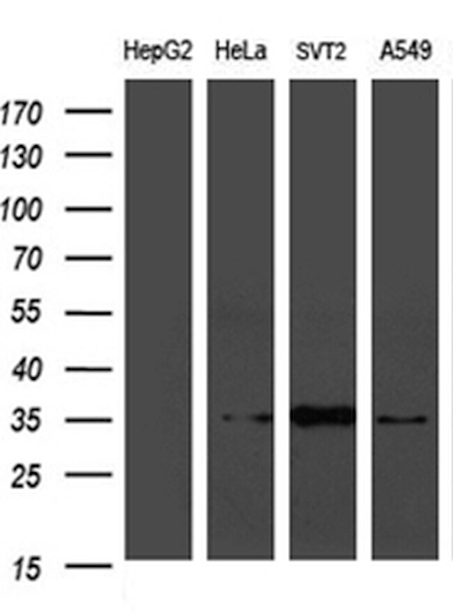 - Western blot analysis of extracts (35 µg) from 4 different cell lines by using anti-PLSCR2 monoclonal antibody. (1:500)