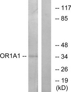 - Western blot analysis of extracts from COLO cells, using OR1A1 antibody. The lane on the right is treated with the synthesized peptide.