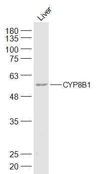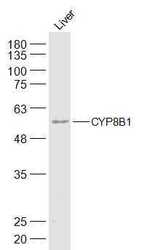 - Mouse Liver lysates probed with CYP8B1 Polyclonal Antibody, Unconjugated (bs-14165R) at 1:300 dilution and 4°C overnight incubation. Followed by conjugated secondary antibody incubation at 1:20000 for 60 min at 37°C.