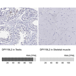 - Immunohistochemistry analysis in human testis and skeletal muscle tissues using Anti-DPY19L2 antibody. Corresponding DPY19L2 RNA-seq data are presented for the same tissues.