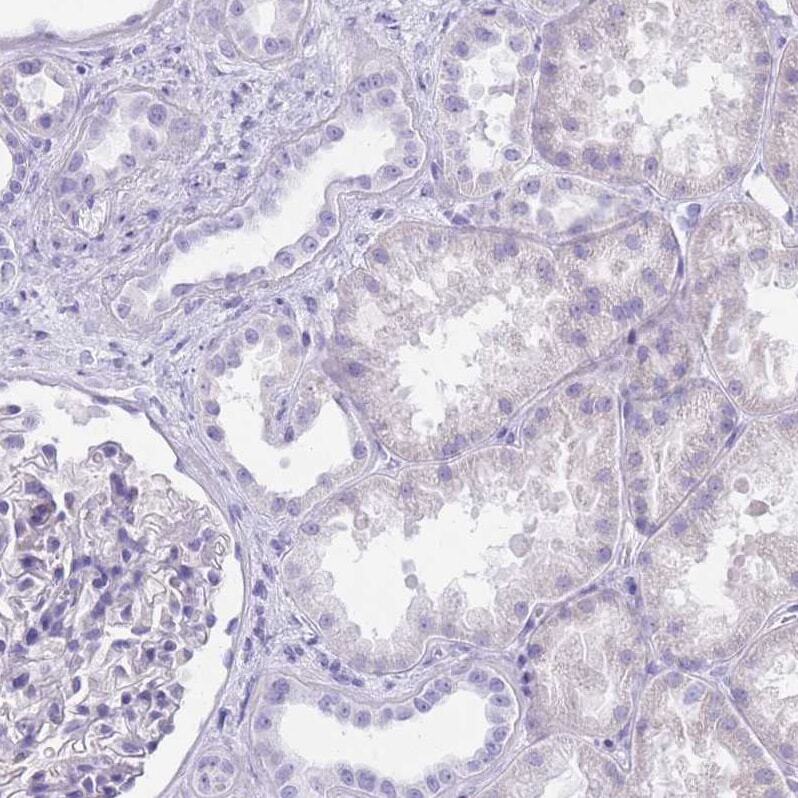- Immunohistochemical analysis of CYP21A2 in human kidney using CYP21A2 Polyclonal Antibody (Product # PA5-83939) shows no positivity in cells in tubules as expected.