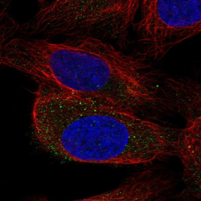 - Immunocytochemistry analysis of ENTHD2 in U2OS cells. Samples were incubated with ENTHD2 polyclonal antibody (Product # PA5-144731). Shows localization to vesicles.