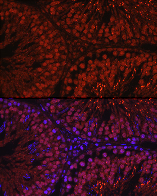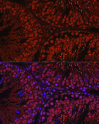 - Immunofluorescence analysis of mouse testis using C1orf146 rabbit polyclonal antibody (STJ11101495) at dilution of 1:100 (40x lens). Blue: DAPI for nuclear staining.