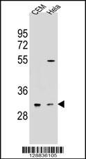 - "OR5L2 Antibody (N-term) (Cat. #AP11066a) western blot analysis in CEM,Hela cell line lysates (35ug/lane).This demonstrates the OR5L2 antibody detected the OR5L2 protein (arrow)."