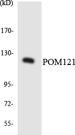 - Western blot analysis of lysates from K562 cells, using POM121 Antibody. The lane on the right is blocked with the synthesized peptide.