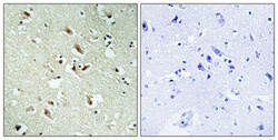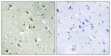 - Immunohistochemical analysis of paraffin-embedded Human brain. Antibody was diluted at 1:100 (4°C overnight). High-pressure and temperature Tris-EDTA, pH8.0 was used for antigen retrieval. Negetive contrl (right) obtaned from antibody was pre-absorbed by immunogen peptide.