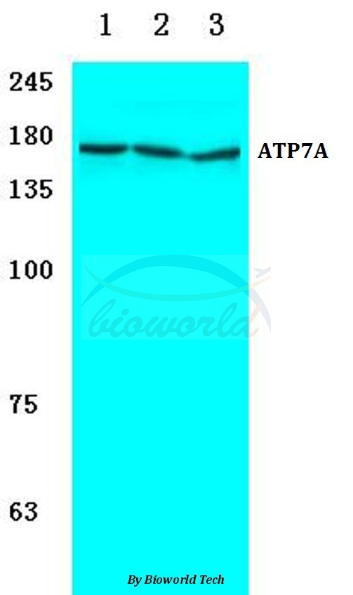 - Western blot (WB) analysis of ATP7A (H640) pAb at 1:500 dilutionLane1:Hela cell lysateLane2:NIH-3T3 cell lysateLane3:Rat brain tissue lysate
