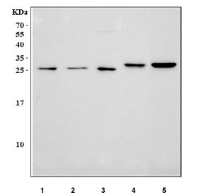 - Western blot testing of 1) human A549, 2) human PC-3, 3) human MCF7, 4) rat liver and 5) mouse liver tissue lysate with Josephin 2 antibody. Predicted molecular weight ~21 kDa.