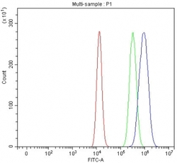 - Flow cytometry testing of fixed and permeabilized human HEL cells with Josephin 2 antibody at 1ug/million cells (blocked with goat sera); Red=cells alone, Green=isotype control, Blue= Josephin 2 antibody.