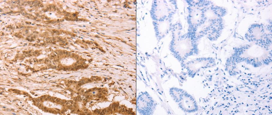 - Predicted cell location: Cytoplasm,Nucleus. Positive control: Human colon and lung cancer tissue. Recommended dilution: 1/25-100 The image on the left is immunohistochemistry of paraffin-embedded human colon cancer tissue using STRA8 antibody at dilution 1/25, on the right is treated with the synthetic peptide. (Original magnification:x 200)