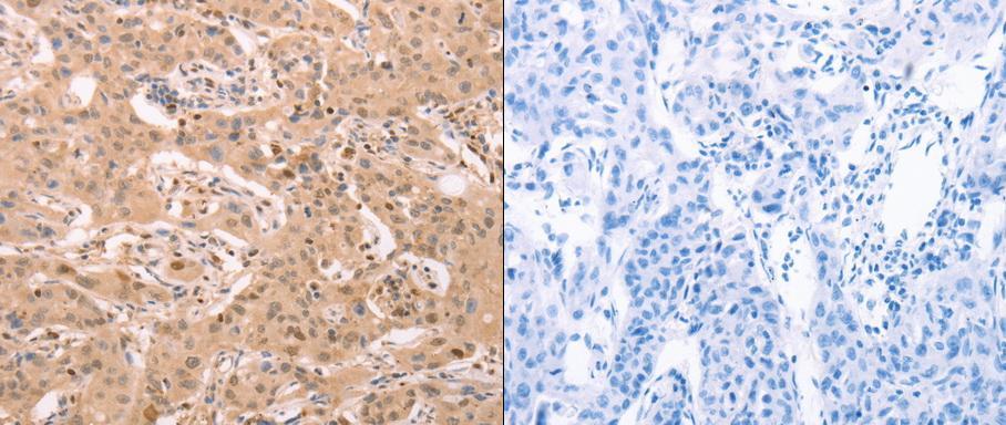 - Predicted cell location: Cytoplasm,Nucleus. Positive control: Human colon and lung cancer tissue. Recommended dilution: 1/25-100 The image on the left is immunohistochemistry of paraffin-embedded human lung cancer tissue using STRA8 antibody at dilution 1/25, on the right is treated with the synthetic peptide. (Original magnification:x200)