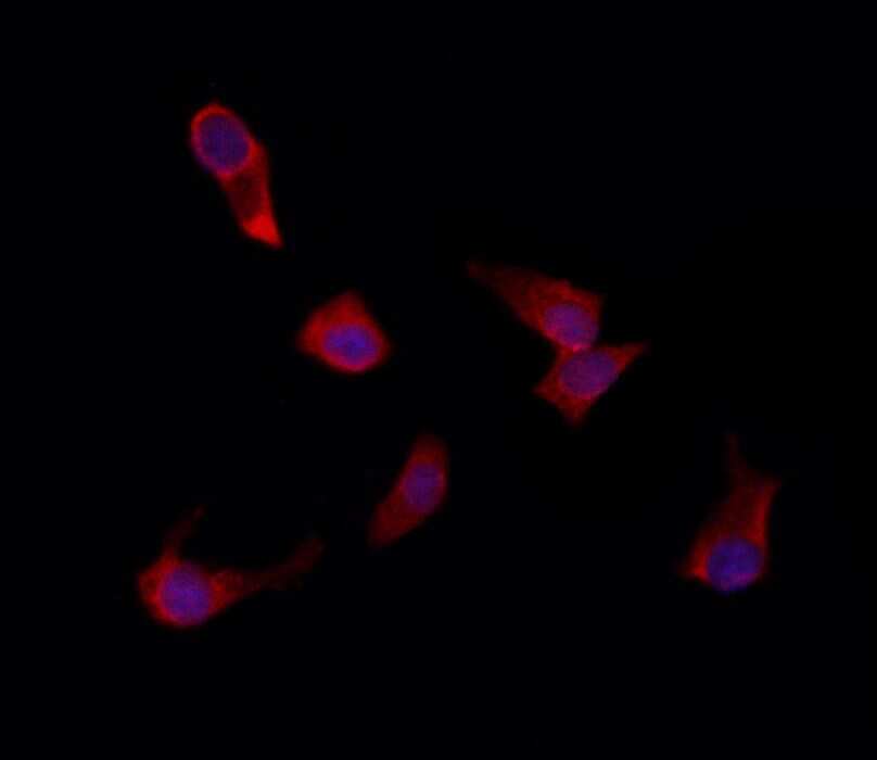 - Immunofluorescent analysis of EPS8L3 in HepG2. Samples were fixed with paraformaldehyde, permeabilized with 0.1% Triton X-100, blocked with 10% serum (45 min at 25°C) incubated with EPS8L3 polyclonal antibody (Product # PA5-99620) using a dilution of 1:200 (1 hr, 37°C), and followed by goat anti-rabbit IgG Alexa Fluor 594 at a dilution of 1:600.