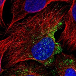 - Immunofluorescent staining of human cell line U-2 OS shows localization to vesicles.