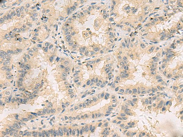 - Immunohistochemistry of paraffin-embedded Human lung cancer tissue using HHIPL2 Polyclonal Antibody at dilution of 1:55(×200)