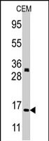 - Western blot analysis of H3F3A/H3F3B polyclonal antibody (Cat # PAB2227) in CEM cell line lysates (35 ug/lane). Histone H3 (arrow) was detected using the purified polyclonal antibody.