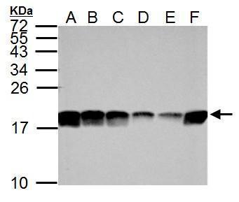 - Sample (30 ug of whole cell lysate) A: Jurkat B: Raji C: K562 D: THP-1 E: HL-60 F: NCI-H929 15% SDS PAGE GTX112955 diluted at 1:10000