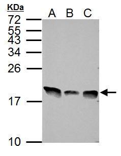 - Sample (30 ug of whole cell lysate) A: NIH-3T3 B: JC C: BCL-1 15% SDS PAGE GTX112955 diluted at 1:10000