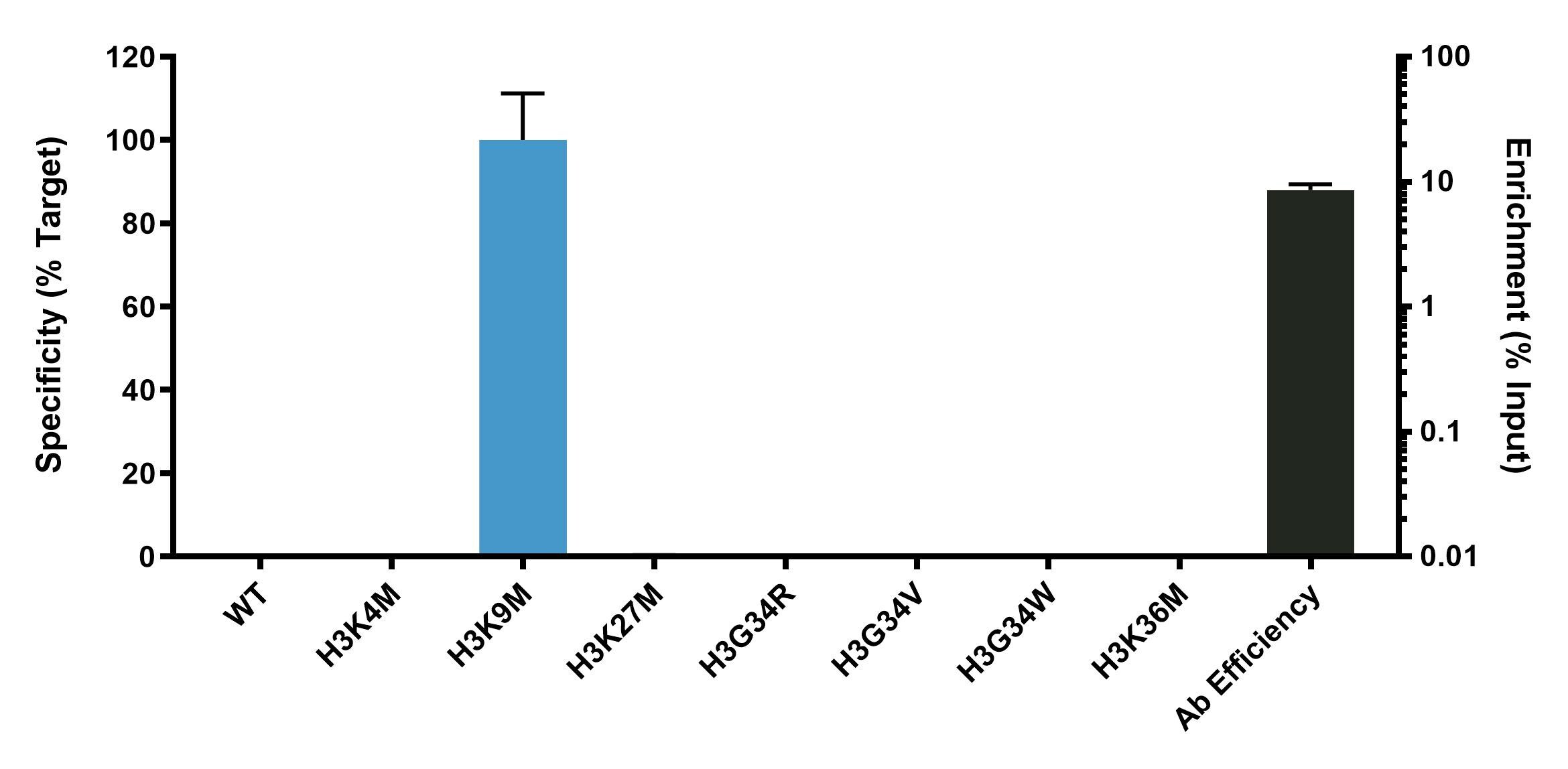 - Antibody specificity was demonstrated by detection of enrichment of the targeted histone modification using SNAP-ChIP™ Spike-in, a proprietary technology developed by EpiCypher™. SNAP-ChIP™ spike-in was performed using H3.3 K9M Recombinant Rabbit Monoclonal Antibody (Product # 702933) and H3.3 K9M was enriched compared to the other histone modifications in the SNAP-ChIP™ OncoStat Panel (Product # A47343).