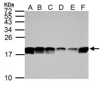 - Western blot analysis of Histone H3.3 using 30 µg of A) Jurkat (B) Raji (C) K562 (D) THP-1 (E) HL-60 and F) NCI-H929 lysate. Samples were loaded onto a 15% SDS-PAGE gel and probed with a Histone H3.3 polyclonal antibody (Product # PA5-29602) at a dilution of 1:10,000.
