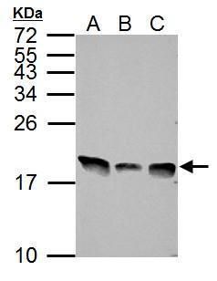 - Western blot analysis of Histone H3.3 using 30 µg of A) NIH-3T3 (B) JC and C) BCL-1 lysate. Samples were loaded onto a 15% SDS-PAGE gel and probed with a Histone H3.3 polyclonal antibody (Product # PA5-29602) at a dilution of 1:10,000.