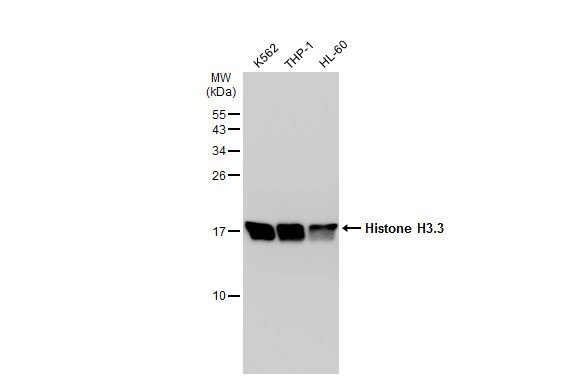 - Western Blot analysis of Histone H3.3 was performed by separating 30 µg of various whole cell extracts by 15% SDS-PAGE. Proteins were transferred to a membrane and probed with a Histone H3.3 Polyclonal Antibody (Product # PA5-29602) at a dilution of 1:10000 and a HRP-conjugated anti-rabbit IgG secondary antibody.