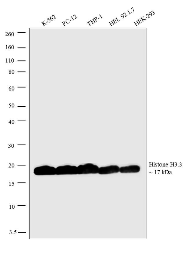 - Western blot analysis was performed on acid extracts (30µg lysate) of K-562 (Lane 1), PC-12 (Lane 2), THP-1 (Lane 3), HEL 92.1.7 (Lane 4), and HEK-293 (Lane 5). The blots were probed with Anti-Histone H3.3 Rabbit Polyclonal Antibody (Product # PA5-29602, 1:5000 dilution) and detected by chemiluminescence using Goat anti-Rabbit IgG (H+L) Superclonal™ Secondary Antibody, HRP conjugate (Product # A27036, 0.25µg/mL, 1:4000 dilution). A 17 kDa band corresponding to Histone H3.3 was observed across the cell lines tested. Known quantity of protein samples were electrophoresed using Novex® NuPAGE® 4-12 % Bis-Tris gel (Product # NP0321BOX), XCell SureLock™ Electrophoresis System (Product # EI0002) and Novex® Sharp Pre-Stained Protein Standard (Product # LC5800). Resolved proteins were then transferred onto a nitrocellulose membrane with iBlot® 2 Dry Blotting System (Product # IB21001). The membrane was probed with the relevant primary and secondary Antibody following blocking with 5 % skimmed milk. Chemiluminescent detection was performed using Pierce™ ECL Western Blotting Substrate (Product # 32106).