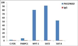 - Enrichment of endogenous ANTI-HISTONE H3.3 protein at specific gene loci using Anti-ANTI-HISTONE H3.3 Rabbit Polyclonal Antibody: Chromatin Immunoprecipitation (ChIP) was performed using Anti-ANTI-HISTONE H3.3 Rabbit Polyclonal Antibody (Product # PA5-29602, 3 µg) on sheared chromatin from 2 million HeLa cells using the MAGnify ChIP system kit (Product # 49-2024). Normal Rabbit IgG was used as a negative IP control. The purified DNA was analyzed by 7500 Fast qPCR system (Product # 4351106) with optimized PCR primer pairs for the promoter of MYT-1 gene, SAT 2, Satellite alpha (SAT A) Repeat used as positive control target, and promoter of C-FOS, PABPC1 used as negative control target. Data is presented as fold enrichment of the antibody signal versus the negative control IgG using the comparative CT method.