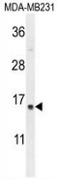 - Western blot analysis in MDA-MB231 cell line lysates (35ug/lane) using SPRR2A antibody Cat.-No. AP54034PU-N (C-term). This demonstrates the SPRR2A antibody detected the SPRR2A protein (arrow).