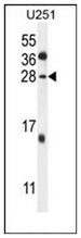 - Western blot analysis of GGTLC2 Antibody (Center) ??in U251 cell line lysates (35ug/lane). This demonstrates the GGTLC2 antibody detected the GGTLC2 protein (arrow).