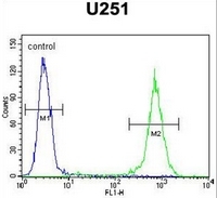 - Flow cytometric analysis of U251 cells using GGTLC2 Antibody (Center) ??(right histogram) compared to a negative control cell (left histogram). FITC-conjugated goat-anti-rabbit secondary antibodies were used for the analysis