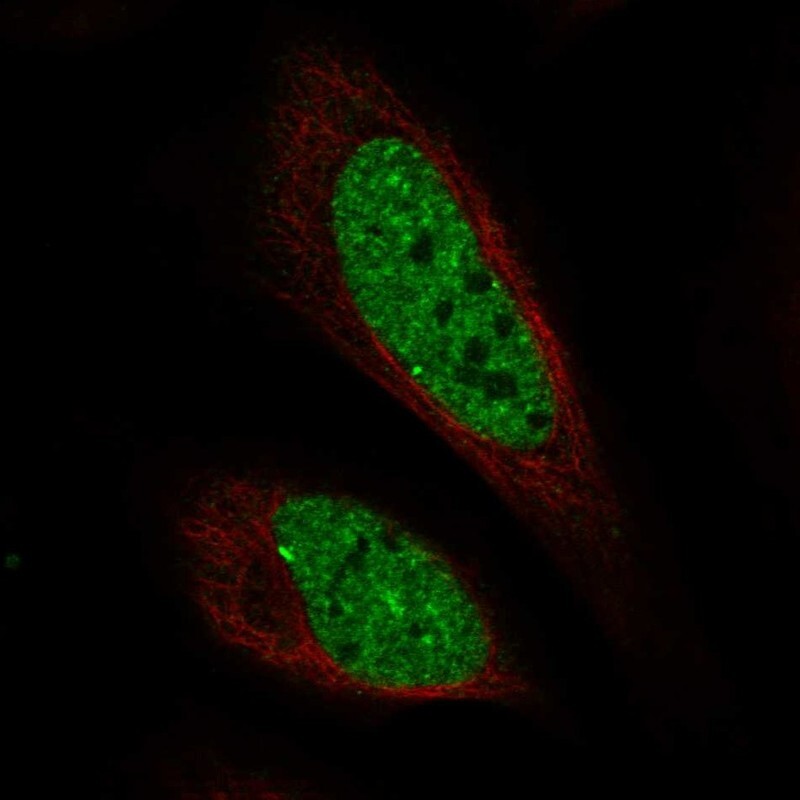 - Immunofluorescent staining of human cell line U-2 OS shows localization to nucleoplasm & nuclear bodies.