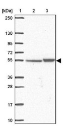 - Western Blot: TMEM246 Antibody [NBP2-33702] - Lane 1: Marker [kDa] 250, 130, 95, 72, 55, 36, 28, 17, 10Lane 2: Human cell line RT-4Lane 3: Human cell line U-251MG sp