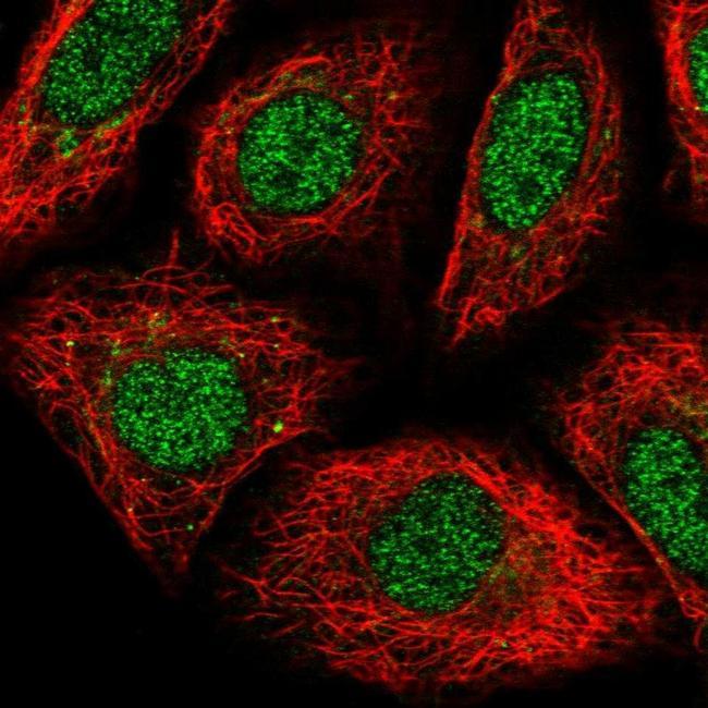 - Immunofluorescent staining of TMEM246 in human cell line A549 shows positivity in the Golgi apparatus & nucleus but excluded from the nucleoli. Samples were probed using a TMEM246 Polyclonal Antibody (Product # PA5-62901).